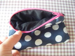 Aujourd’hui, je vais vous parler de mes 1ères pochettes doublées, prêtes à tout pour nous suivre. Mon 1er modèle bleu à pois blancs était censé être une pochette à soufflet avec un arrondie sur le dessus. Pouah… je vous le déconseille fortement pour commencer !! 😉 Ce n’est franchement pas pratique.