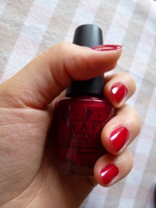 Néanmoins quand je fais l’effort d’en mettre (comme pour ce week-end par exemple), j’opte très souvent pour le rouge brique de OPI, plus précisément le modèle « Quarter of a cent-cherry ». Une vrai merveille !! Hiver comme été, j’ai un vrai plaisir à le porter.