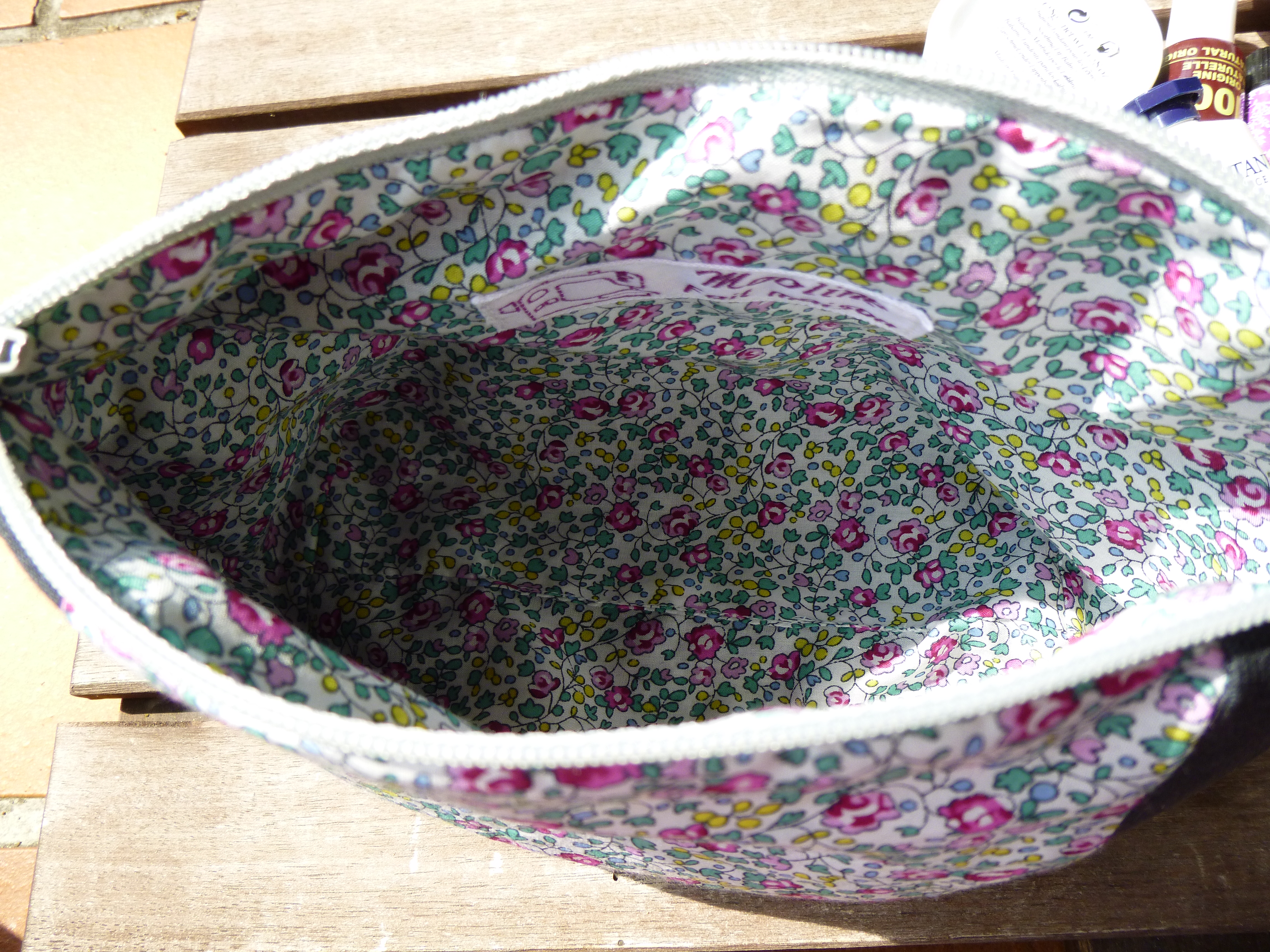 Après une bonne heure de travail où j’avais fait les soufflets, les coins (bien plus facile sur du tissu simple que de l’enduit!) et la face bicolore…je dois dire que c’est de loin ma trousse préférée ! J’adore ce tissu liberty 😀