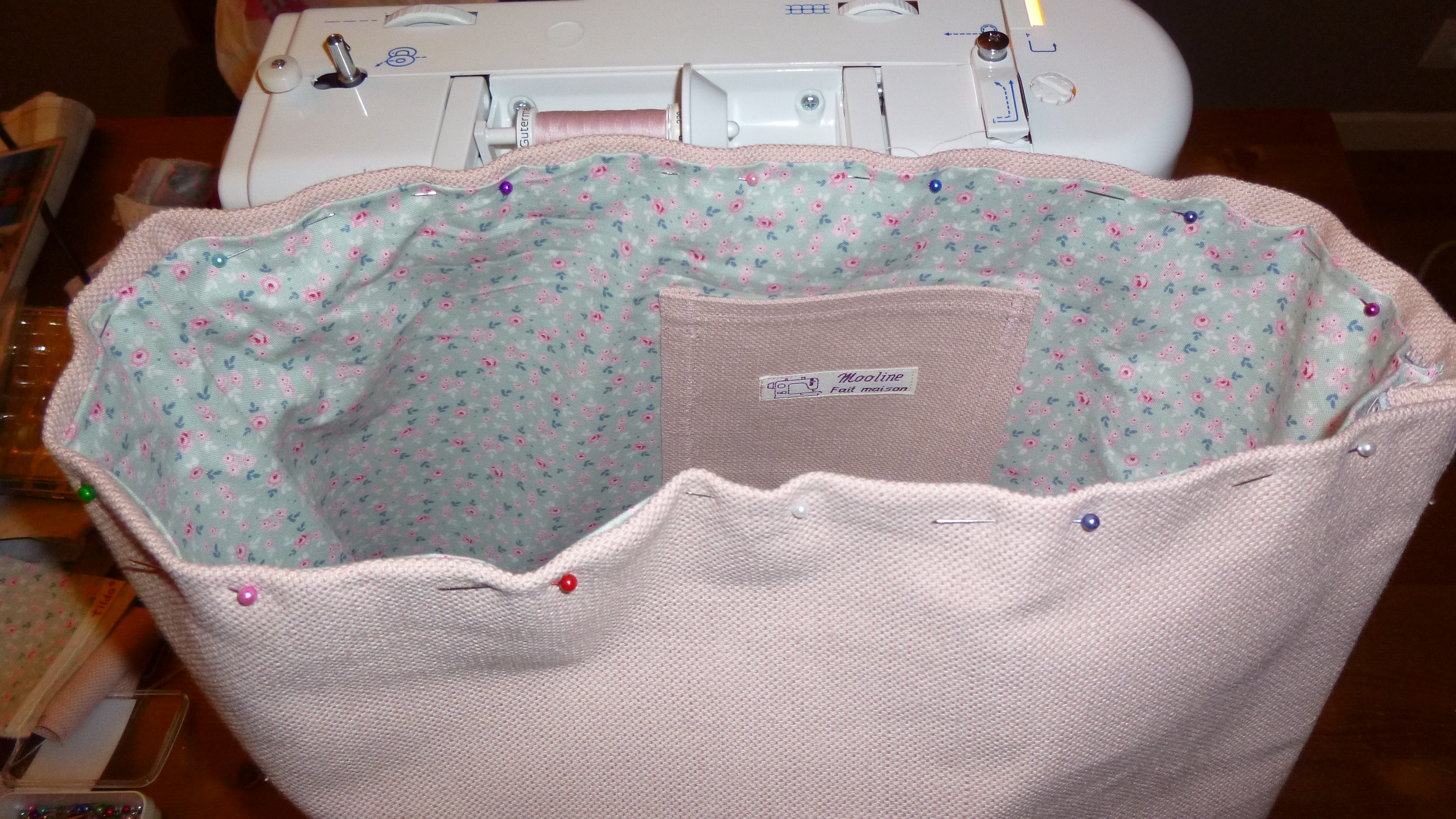 2. Assembler l’ouvrage AC avec les pans liberty D. J’ai décidé de coudre sur le tissu extérieur rose les pans de liberty Tilda (D). Ça consolide le bas du sac mais vous pouvez aussi couper le tissu ext. qui ne se voit pas et joindre les faces AC à D.