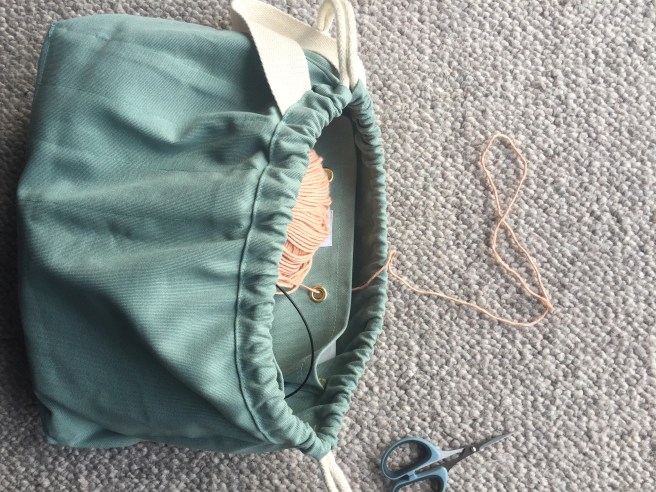 Pour le nouveau défi (again) que je me suis lancée, à savoir tricoter un gilet, je cherchais un petit sac pour trimbaler mes pelotes dans la voiture. Ne pas rater un moment d’avancer vu que je suis lente… 🤣