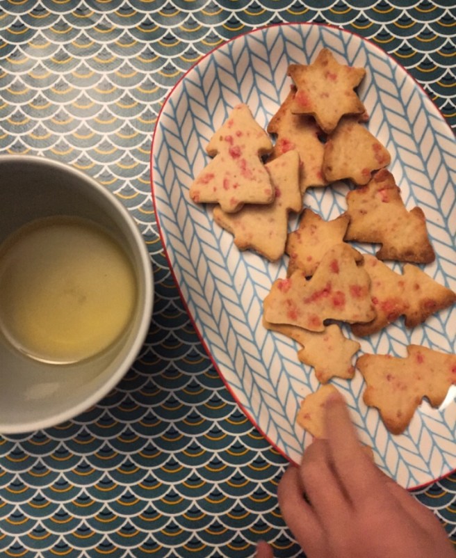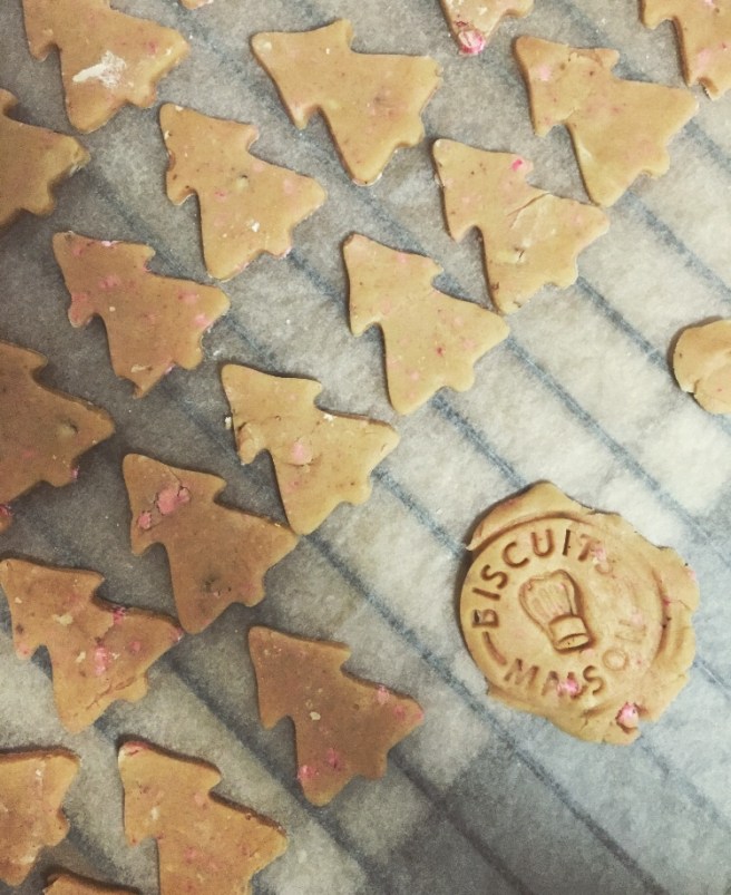 Etalez la pâte sur 3 ou 4 mm d’épaisseur sur de la farine. Découpez avec les formes de votre choix. Si cela colle trop, rajoutez de la farine.