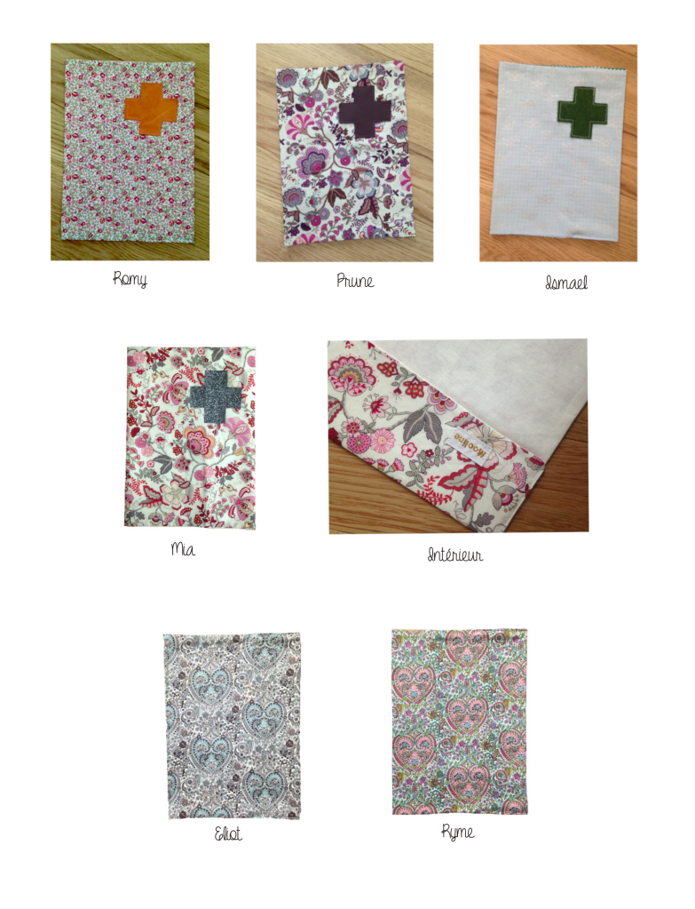 Coton doublé, avec ou sans croix feutrine ou cuir selon le stock. Dimensions 23×17 cm. Tarif 15 euros.